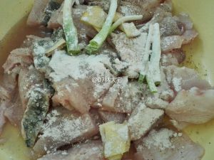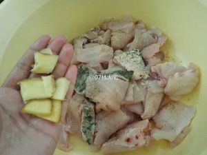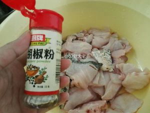 加料酒,胡椒粉,盐,姜粒,蒜粒,淀粉开始腌制鱼片,至少也要腌半个小时