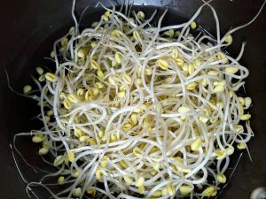 上锅煮水,水烧开后,将豆芽入锅烫半分钟左右.捞出放一边备用.