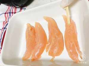 最好提前一晚进行腌制。将鸡胸洗净,用厨房纸擦干,用牙签戳一些洞这样更好入味。如果是鸡大胸,片成较薄的两层分开