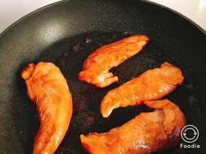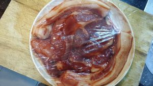 将叉烧酱和酱油搅拌均匀,放入鸡胸肉抓匀。盖上保鲜膜入冰箱一晚
