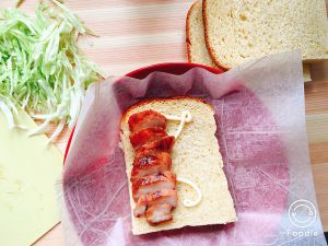 挤一点沙拉酱然后铺鸡肉,铺两排这样后面好切