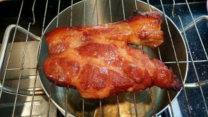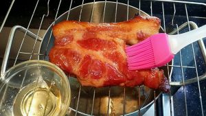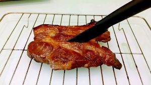 230-250度预热烤箱,把腌好的肉放到烧烤架上,230-250度烤15或12分钟,有的烤箱最高温度是230度就烤15分钟,最高温度是250的烤12分钟,之后调210度继续烤25分钟,把白开水倒入麦芽糖碗中搅动至麦芽糖完全融化,自制麦芽糖派上用场了。然后取出叉烧肉均匀的刷上麦芽糖水,再继续烤12-15分钟,这期间可以再取出刷一次麦芽糖水