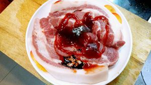 将肉均匀地抹上叉烧酱,加入葱段、蒜蓉、姜片一起拌匀。放入冰箱腌制一个晚上