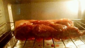 入烤箱,210度烤20分钟,取出,搽上腌肉的汁,顺便翻个面,再烤15分钟
