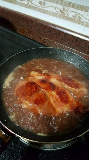 将腌制的汁加入少量的水,并倒进平底锅中。大火烧开,之后转小火慢慢收汁。