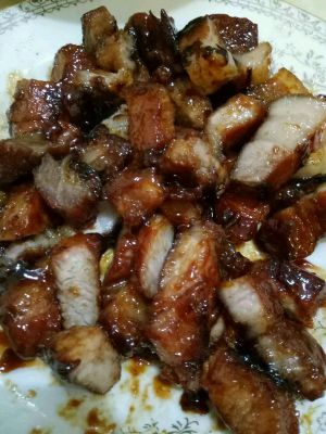 打开电磁炉,在锅里涂上一层薄油,待锅热后放上肉,慢火煎(小火),由于肉涂了叉烧酱,很容易糊底,所以要控制好火候,煎至两面微焦即可,上碟,然后把锅洗干净,擦干,重新开火,把叉烧倒进去,加上适量的蜂蜜,把蜜汁煮浓稠收干即可。