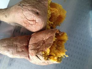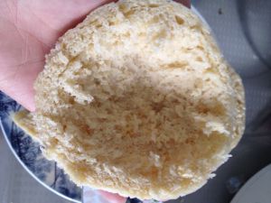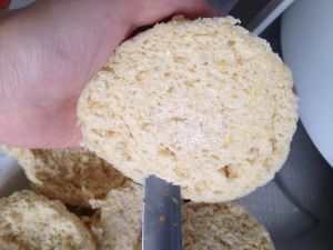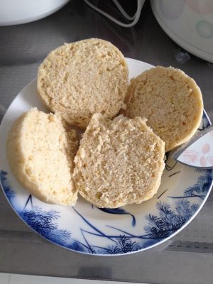 馒头蒸好后取出 对半切(如果太大也可以切三份 总之为后面挖瓤做准备)