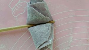 另,火腿肠切两断,面揉成食指粗长条状,绕着火腿肠卷好。