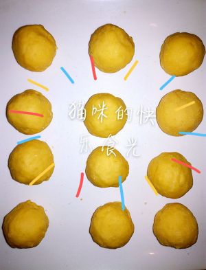 揉面排气(尽量多揉哈,把空气排干净,这样做出来的馒头才会有劲道哦),均分成12个小面团,盖上保鲜膜松弛10分钟。