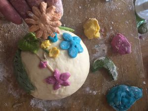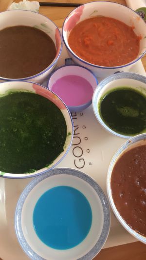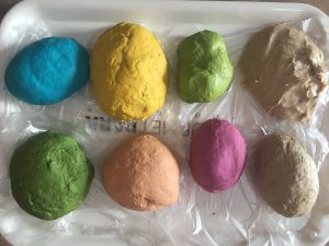 所有的材料对半分,做出蓝色,白色面团。混合均匀
