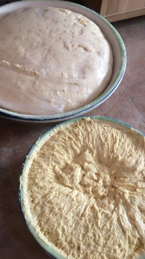 放在温暖的地方发酵(目测面团发酵后的体积至原来体积的2倍大小即可。用手指沾些面粉插进去,如果出现不立即回弹的凹洞就表明面团发酵完成了)。