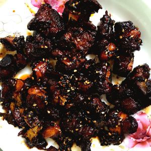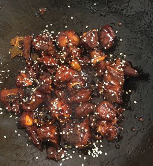 炖到快要干的时候,放少许的盐,不要放太多哦,翻炒几下,再撒些白芝麻,开中火让排骨把汁完全吸干,就出来出锅,上盘了