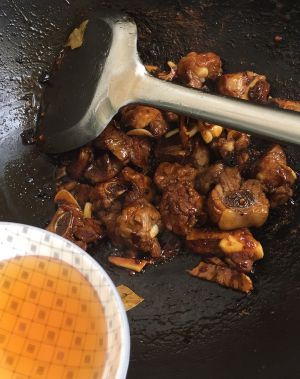 待糖化慢慢变棕色的时候,(此刻注意火候,不要让糖太焦了)放入焯好的排骨翻炒,让排骨均匀地裹上糖色,加黄酒,盐,蒜翻炒片刻,然后加入水没过排骨