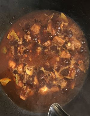 调料放完再翻炒下,就可以加入开水没过排骨,不要放凉水哦,不然肉会变硬,要是你喜欢吃烂点的排骨就放多点开水,我这个量就是炖了30分钟这样,是要开小火炖的哦!