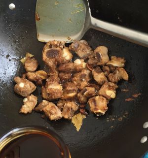 然后把排骨放进去翻炒均匀,就可以放其他调料了,酱油尽量放到可以让排骨完全着色,我个人比较偏爱老干妈豆豉酱,所以放的多一点