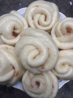 前后在把铺好的面团皮卷起来,从中间切开后就是这样啦!在然后吗上锅蒸15分钟后不着急忙接来,在让它在里面呆五分钟