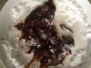 在面团发酵的时候我们来准备豆沙馅儿,糯米粉少量加入做好的豆沙,再加入少量清水搅拌均匀,糯米粉和豆沙比例是1:1