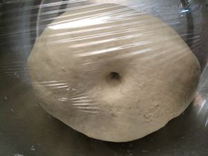 第三步:放在温度高的火炉子旁边发酵,面团有2倍大差不多了。面团发酵好,就是揉面,因为是2个面团,揉的就有点麻烦,2个来回换着揉。