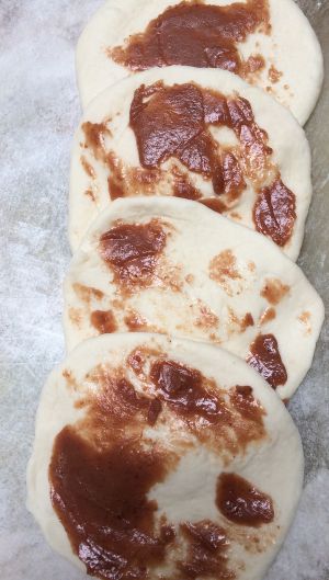 把擀好的面团皮一层一层的图上搅拌好的红豆沙