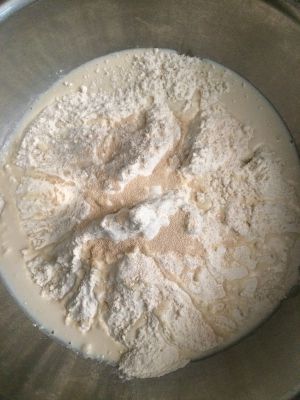 面粉、白糖、炼乳、南瓜放入盆中。加入化开的酵母水搅拌。
