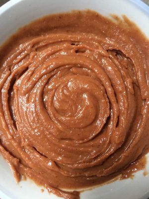 南瓜去皮、切片、上微波炉蒸7分钟、然后搅拌成泥