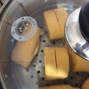 放入有笼布的蒸锅里,我是冷水开始蒸的。大约蒸15分钟,先大火,约五六分钟时调成中火。ok,香香甜甜的黄金馒头就大功告成啦
