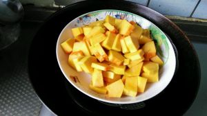 把南瓜去皮,切块,放锅里,隔水蒸,约20分钟,蒸熟透。