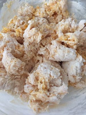 制作前的准备: 往肉糜里加盐、味精、20克白砂糖、200克清水和妙可蓝多车达奶酪酱,一起搅拌均匀。再往面粉里加入酵母、泡打粉、30克白砂糖、400克清水,搅拌成面团。