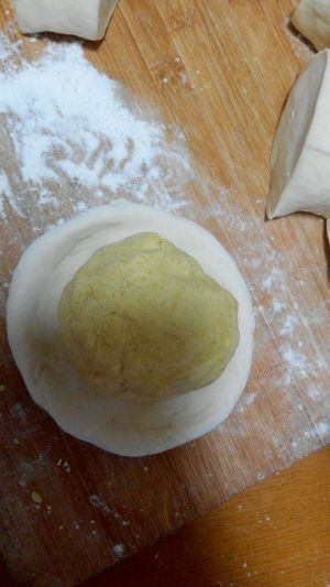 揪一块黄米面揉成球球状 放在抻好的面上 开始包 包好后把有褶的地方朝下 搓高