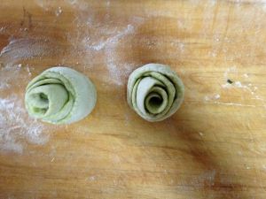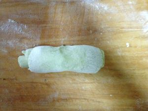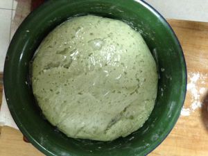 青菜汁加热到36度左右,适量安琪酵母和白糖混合,用加热的青菜汁稀释,和面静置约30分钟,直直面醒发为原来的2倍大