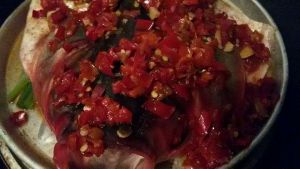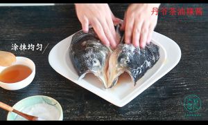 将事先准备好的辣椒酱涂抹在鱼头上