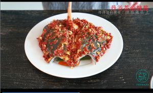 鱼头摆好盘,均匀涂抹辣酱