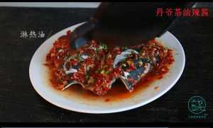 烧热油淋在蒸好的鱼头上