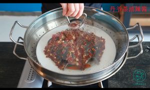 开锅后放入鱼头蒸10分钟,淋鱼头上一些豆豉鱼油味道会更好,八分钟时关火焖2分钟,(剁椒要先油炒后放鱼头上)