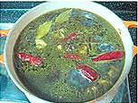 将铁锅空锅开火加热,倒入植物油,待油7成热时,加入大料、桂皮、香叶及花椒翻炒30秒爆香。