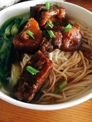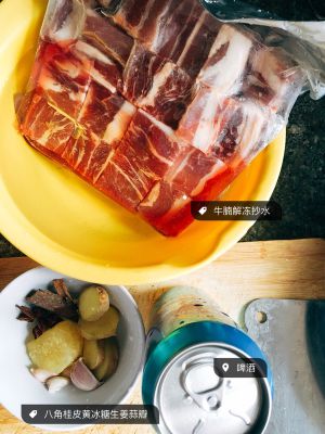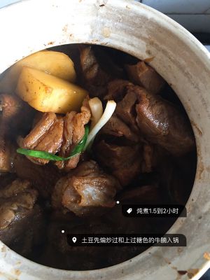土豆 和上好糖色的牛腩入砂锅 放葱段 生抽老抽比例一样直接到下去 一罐啤酒直接到下去 这是不放水的秘密 直接烧开 转小火炖煮1.5小时 关火 焖半小时
