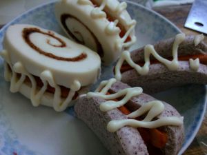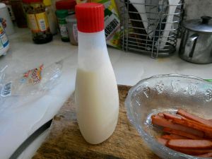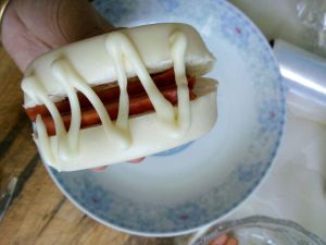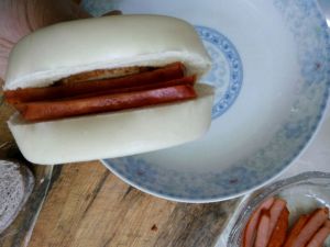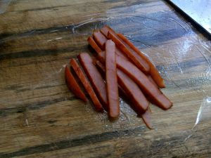 我用的是一块火腿肉饼 把肉饼切成条状 拿培根或烤肉因该也很不错哦