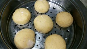 将面粉倒入南瓜泥中,加入大概一小勺酵母粉开始慢慢揉,直至揉得不粘手,面粉可以慢慢加入,(南瓜泥和面粉的比例大概1:2)搁置一个小时左右进行发酵。发到是原来面团的2倍大,拿手指按个洞不反弹既可。