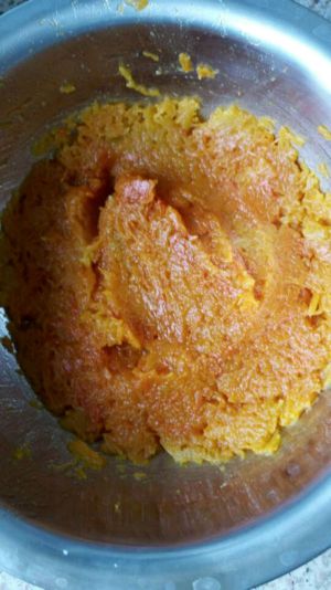 将南瓜洗净切块放锅蒸熟,大概十五分钟,然后去皮,将南瓜瓤放入盆中捻成泥状。(半个南瓜大概得500g南瓜泥)