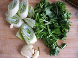 葱白斜切成小段,大蒜用刀拍一下,香菜切成1.5cm的小段。