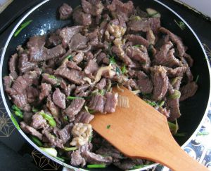 找一口平底锅,倒入适量植物油,开大火,把牛肉和葱蒜香菜一起倒入锅中不停翻炒,翻炒到牛肉完全变色、锅里水分完全蒸发为止。最好用平底锅,这样水汽散的比较快。