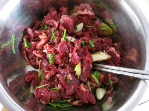 把盐、酱油、一半的香菜、葱蒜和牛肉放在一起拌匀,腌制20分钟。