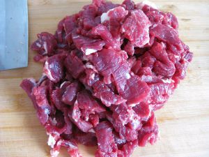 铁锅烧热 ,不放油,将肉片放入锅内煸炒至7分熟,目的是为了去除羊肉中的水分,缩紧羊肉。