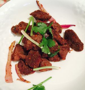 加孜然和胡椒粉辣椒面,大火炒匀出锅。装盘,香菜段装饰,完成啦。