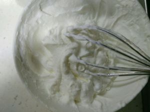 把100克淡奶油和白砂糖放进大碗中,用手持电动搅拌器把淡奶油打到软性发泡,有一点点凝固感