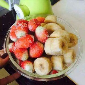 香蕉剥皮切段,和草莓一起放入冰箱冷冻6小时