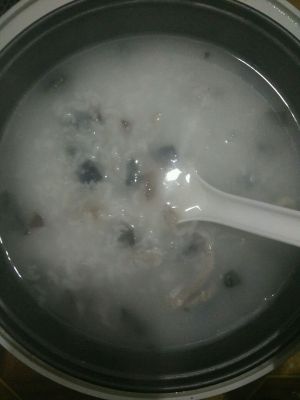 (忘了照中间煮的照片了。)水煮沸,下姜丝,下肉。下肉后,记得去上面的浮沫,然后再倒入大米,煮30分钟,熬出米油,下皮蛋以及葱花。(最后出锅点香油,撒点小葱花提香)