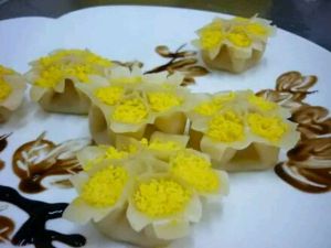 还可以用蛋黄填花瓣上的孔,也可以不要,蒸熟出锅,可以用酱汁画枝叶装饰