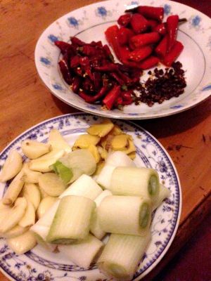 准备配料。姜切片,蒜切片,葱切段,干辣椒切段,泡椒切段,花椒备用。
