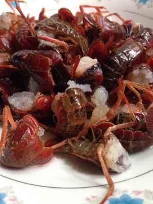 小龙虾买回来后要用清水冲洗几遍,然后开始剪下虾的八个小足,掐住尾部最后面中间的一片虾尾,使劲拽出虾线,再那个干净的硬毛刷子把虾里里外外洗刷干净。